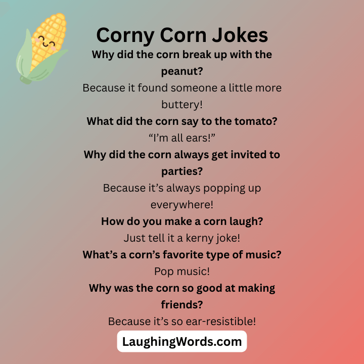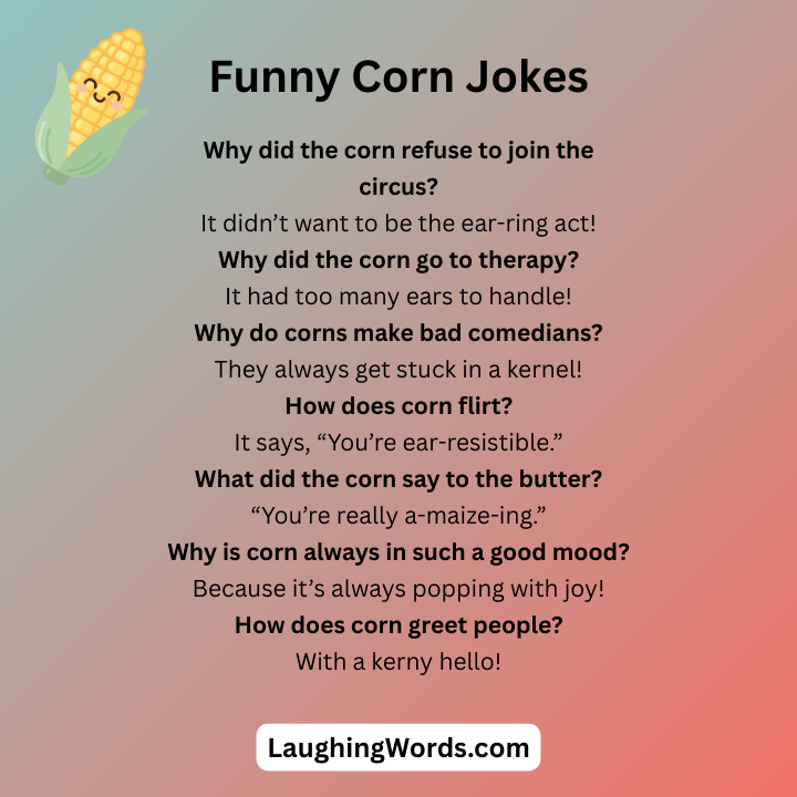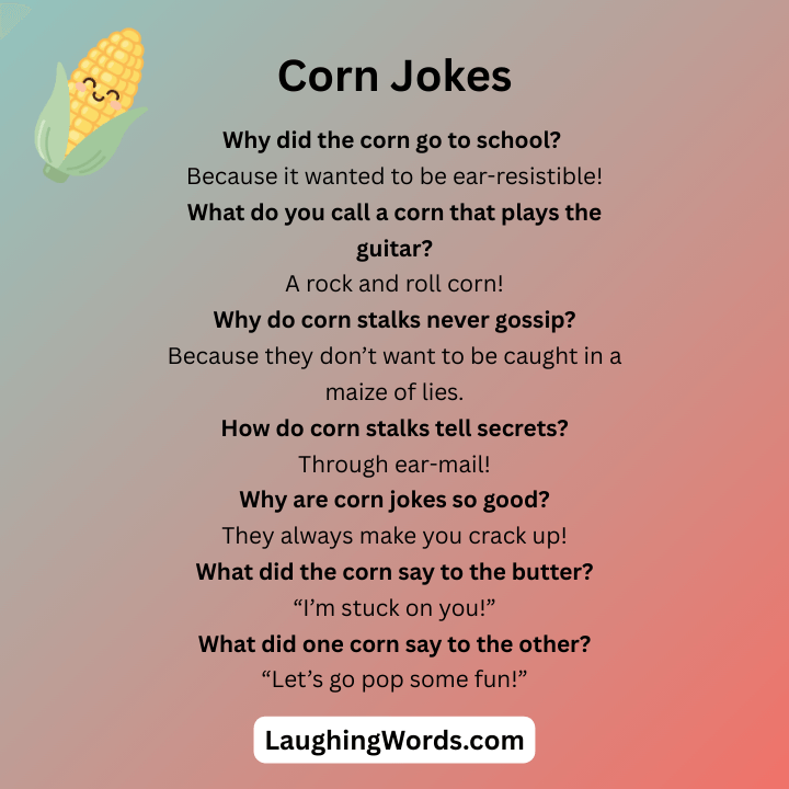Get ready to laugh with these funny corn jokes! Whether you love puns or just want a good laugh, these jokes are sure to make you smile. From silly punchlines to corny humor, these jokes will brighten your day. So, sit back, relax, and enjoy some fun corn jokes!