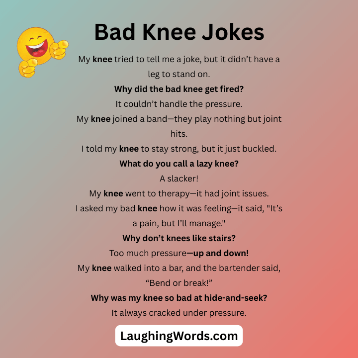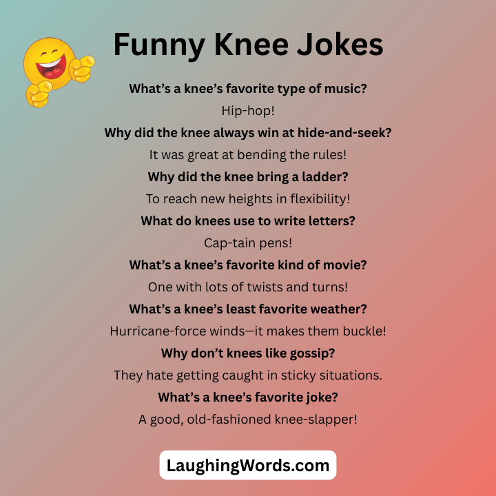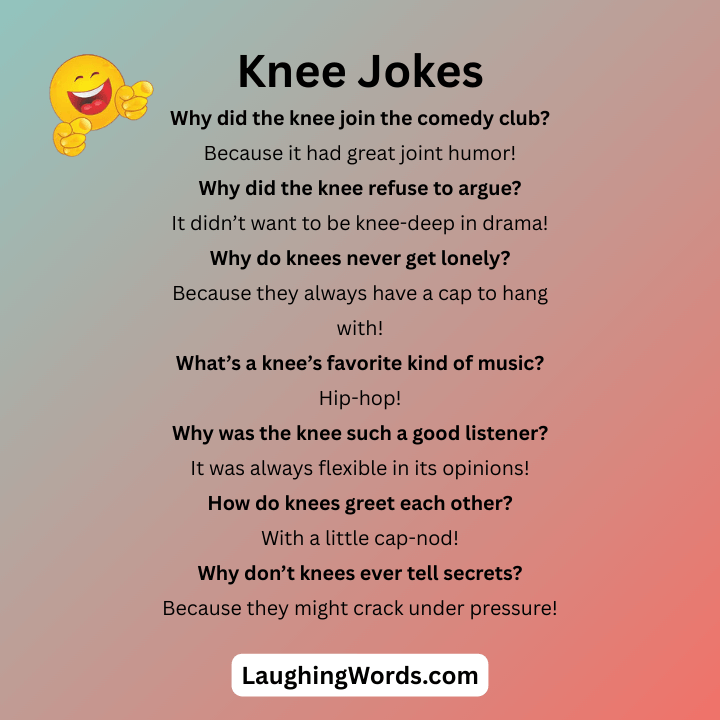 Looking for some jokes to make you laugh? These knee jokes are sure to keep you smiling! Whether you love puns or funny one-liners, we’ve got plenty to crack you up. Perfect for a quick giggle, these jokes are all about keeping things light and fun. Get ready to laugh and enjoy!