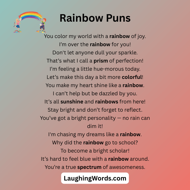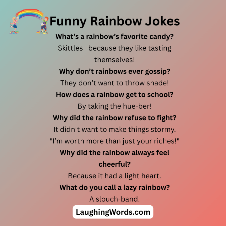 Rainbows aren’t just pretty to look at they can be super funny too! If you need a little cheer or want to make your friends laugh, these funny rainbow puns and jokes are perfect. Whether you’re dreaming of pots of gold, enjoying the colors, or just in the mood for some fun, these jokes will bring a smile to your face. Get ready to enjoy some colorful laughs!