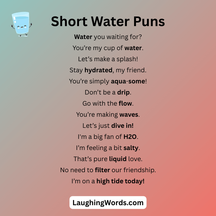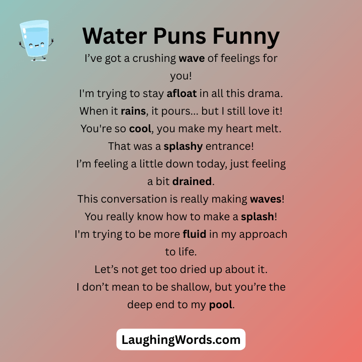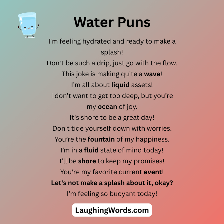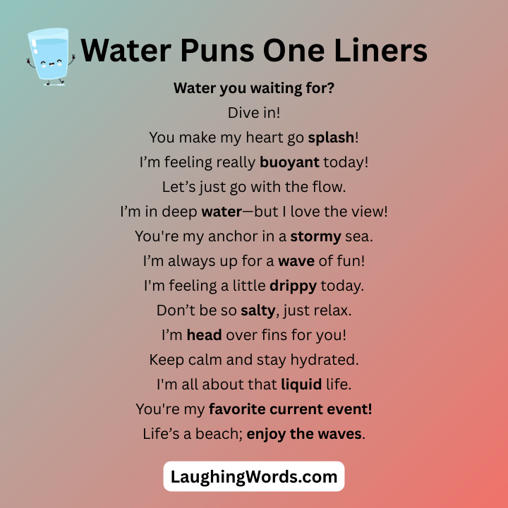 Get ready to dive into a wave of laughter with these water puns that are sure to make a splash. From clever wordplay to light, bubbly jokes, this collection is packed with humor that flows effortlessly. Whether you love the ocean, rivers, or just a good laugh, these water puns will swim straight into your funny bone and keep the smiles floating.